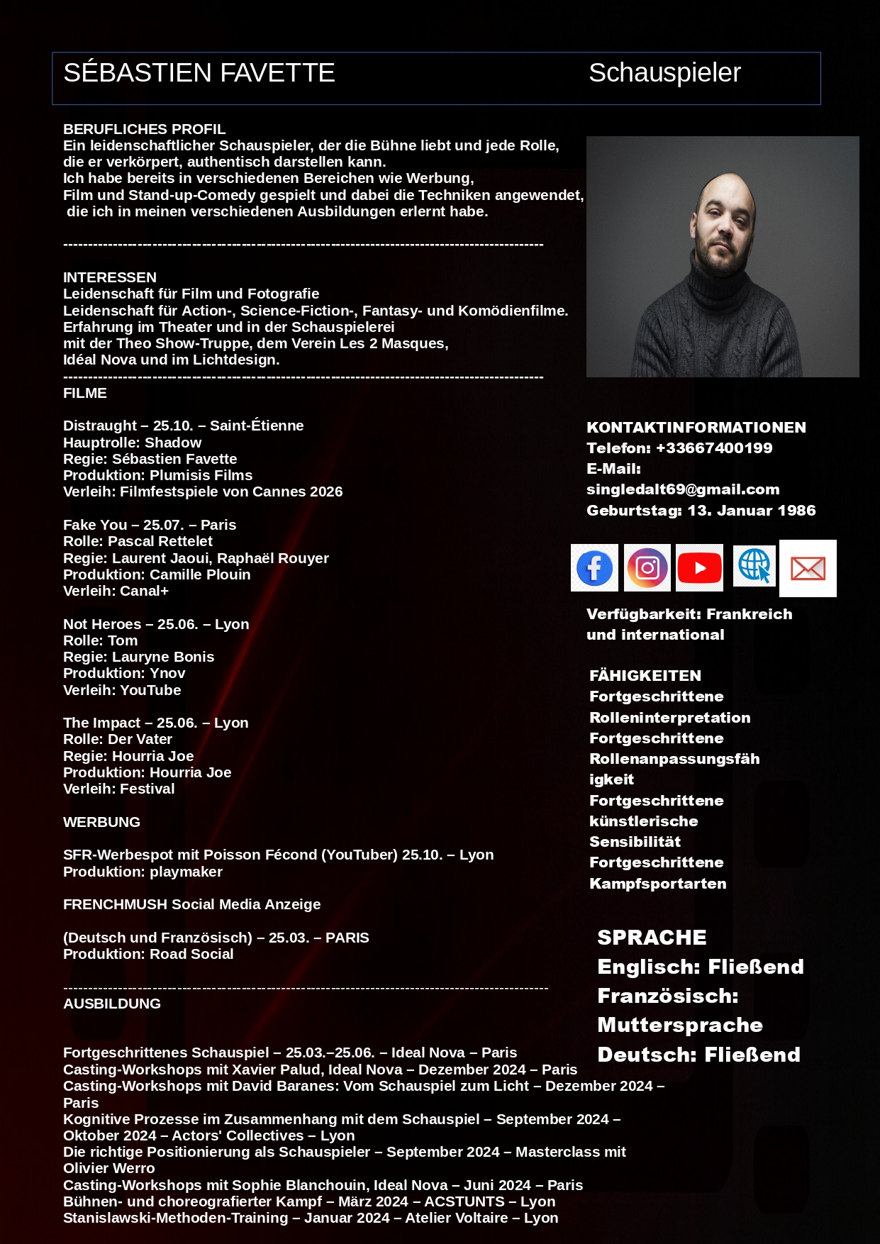 Mon CV artistique PDF est désormais téléchargeable directement depuis mon site officiel. Il inclut toutes mes expériences de cinéma, télévision et publicité, mes photos professionnelles et mon showreel 2026. Cette ressource permet aux directeurs de casting, producteurs et agents artistiques d’accéder facilement à mon profil complet et de me contacter pour des castings et projets audiovisuels.